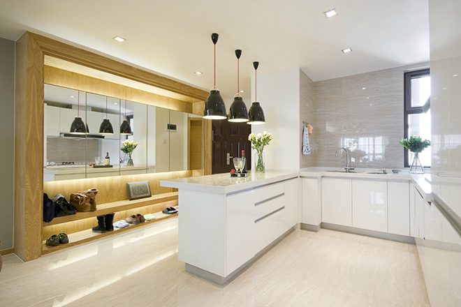 3、生態木吊頂表面光滑細膩,不需要砂光和油漆,若真的喜歡其他顏色,生態木較好的油漆附著性也是可以隨心噴涂的。可以將生態木吊頂的顏色涂飾成與櫥柜相近的顏色,與櫥柜協調搭配,滿足你家居顏色的要求。