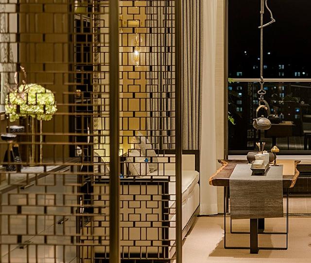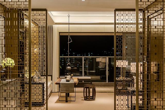 客廳區(qū)藉由色彩以及家具突出空間低調(diào)奢華的質(zhì)感,就色彩方面而言,設(shè)計師采用多樣色相串聯(lián)多方元素。天花板、地板以及墻面采用淺色色調(diào)提升空間的明亮感,深色家具以及大理石電視墻則賦予了整體開揚而幽邃的場景特色。在本案公共區(qū)域場景中踱步,可見木質(zhì)屏風(fēng)優(yōu)雅佇立于空間。屏風(fēng)以囍字格為形,引領(lǐng)視線的錯落與節(jié)奏,增加了空間的變化與層次。設(shè)計師拓寬了廳區(qū)的功能,在廳區(qū)一隅打造一方茶室,可在閑暇之時與親朋好友“加起炊茶灶,聲聞汲井甌”,邊話家常邊飲玉茗,享得悠然意境。
