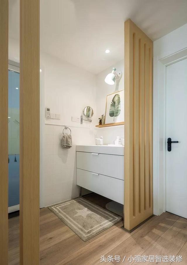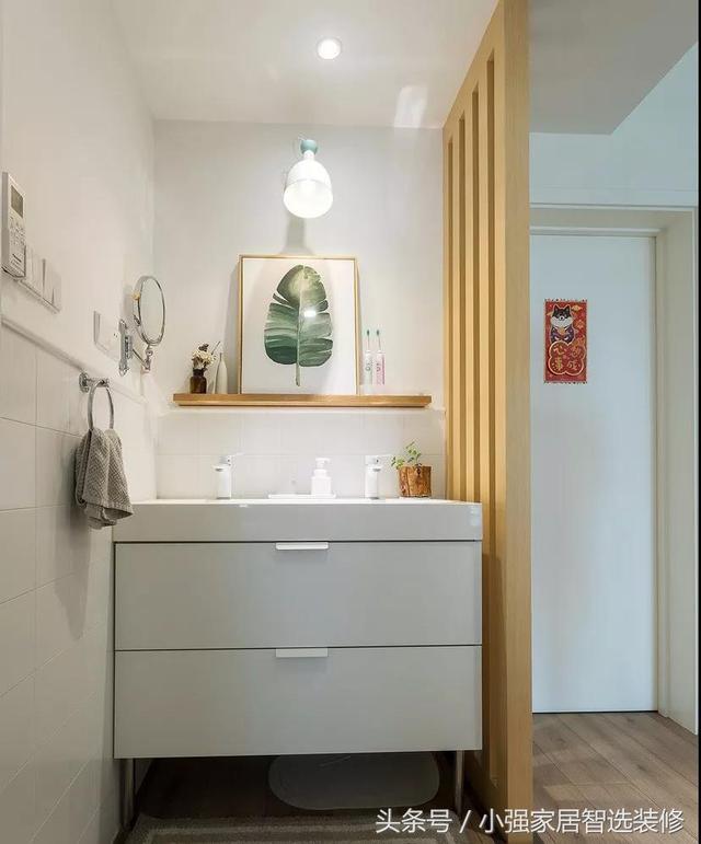 衛生間干區整體以白色搭配原木色為基調,一幅綠葉裝飾畫,加上木盆里的綠植,清新有氧的氣息撲面而來。