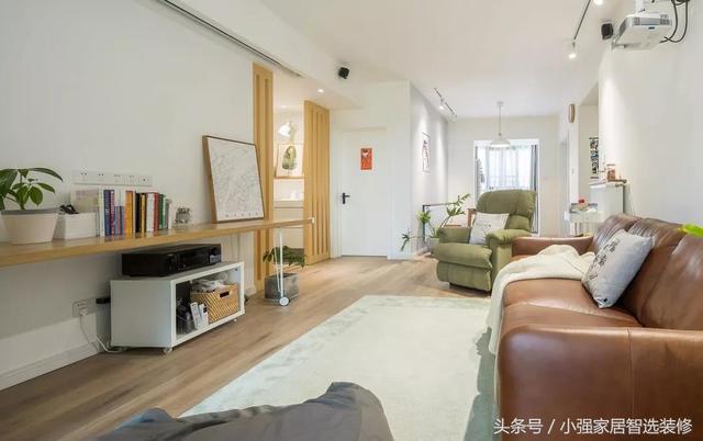 客廳木質地板與白色墻面結合,頂面裝上一排軌道燈,當燈光點亮,空間溫暖和煦,給人以踏實的安心感。
