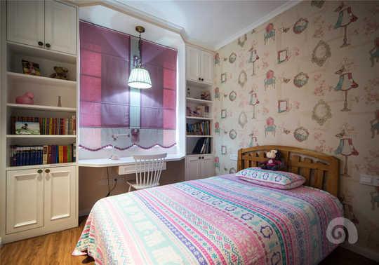 書桌上的吊燈無不透露出精致的感覺,窗簾和床品搭配一點女孩子喜歡的粉色。