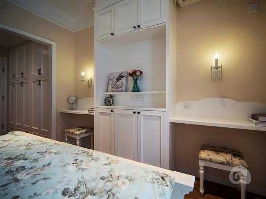 配合主臥功能需求,設計了一個電視柜和兩邊對稱的小書桌,可以實現(xiàn)梳妝,用筆記本辦公等多種功能。