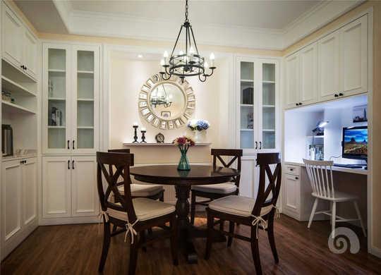 由于餐廳在客廳的縱深部位,所以墻面家具的顏色選擇白色。利用餐廳環(huán)繞的三面墻,分別做了餐廳背景墻,書柜,餐邊柜,書桌工作臺等多功能柜體組合。