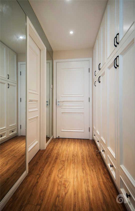 這是從客廳進主臥的一個小通道,進門左手邊設置了一排收納柜,右手邊設置了一個衣帽間,走道的一面墻采用鏡子鋪貼的設計,拉伸空間,又能當換衣鏡。