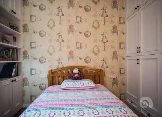 再床的另外一邊安排了一個到頂?shù)囊鹿瘢梢詽M足小孩子衣物收納的需求,同時柜子頂部的吊柜可以作為整個空間收納的補充。