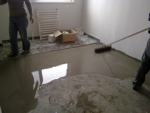 在界面劑干燥之后,就可以將攪拌好的自流平水泥倒在地上,倒到地面上之后,水泥可以順著地面流淌,但是不能完全流平,需要施工人員用工具推桿水泥,將水泥推開推平。