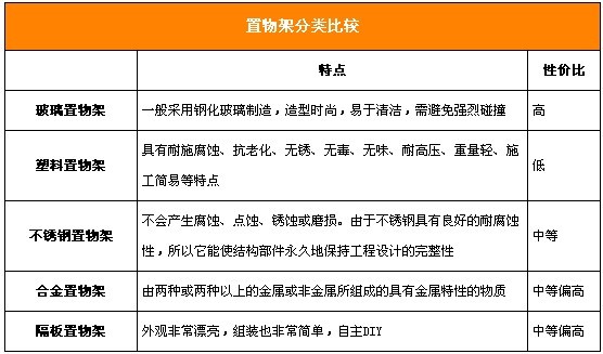 置物架有不同的材料,一般包括玻璃置物架、塑料置物架、不銹鋼置物架、合金置物架以及隔板置物架。