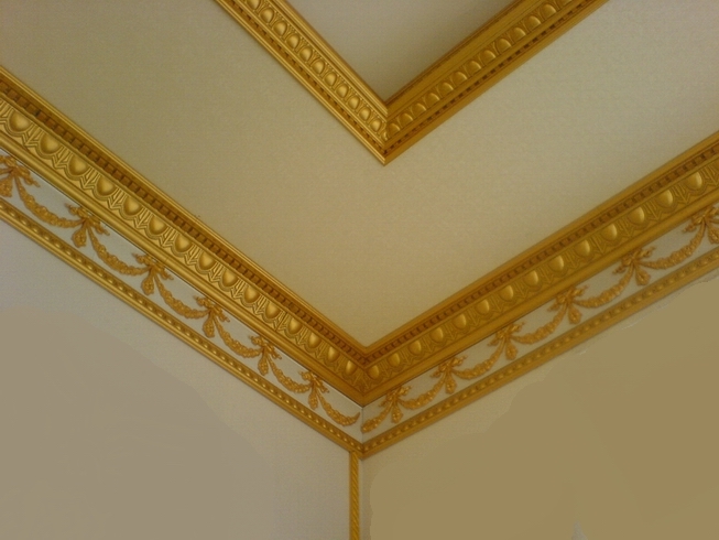 4.在陰角線安裝的對縫接口處,做好拼花的處理,當然拼花要在地面先裁好,這樣可以保證拼花的完整。兩邊的線條需要保持平滑,在接縫的位置用膩子抹平,要注意石膏膩子不要破壞線型。