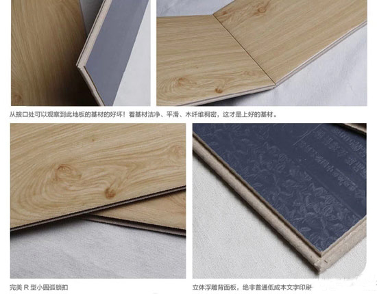 產品表層選用的是進口裝飾層,具有紋理清晰自然,紫外線照射持久不褪色的特點。而基材木質緊密無雜質,內結合強度高,抗壓能力強,適合地熱環境鋪裝。