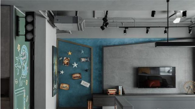 兩道柜體的側邊創造出黑板區,成為家人情感交流的留言版或是小孩的涂鴉墻。敞朗日光隨著客廳落地窗引入室內,映照在個性化的材質與細節上,讓美學色彩更加鮮明。