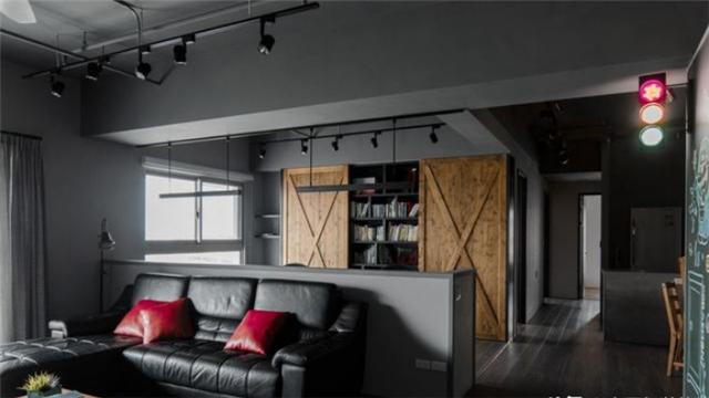 將原有的一房拆除,以矮墻隔間出書房區,讓公領域的空間感擴大,書墻兩側結合谷倉門為收納門片,呼應工業風的迷人特質。