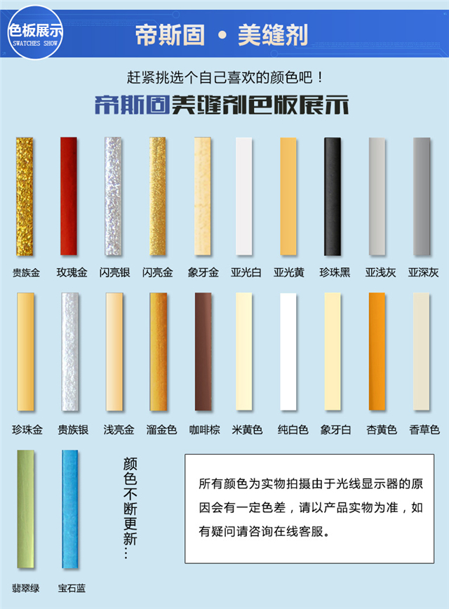 帝斯固的美縫劑強度大,耐刮擦,脆性小,柔韌性高.上墻不流、下地不凹的、具有一定的亮度、光澤度、色粉細膩、硬度如瓷、柔韌性好,專業瓷磚美縫劑生產廠家。當然貴肯定是有貴的道理,但我肯定是不建議您買比較便宜的產品,因為用上去之后會比較強硬反而起不到美觀的效果,蒂斯固的美縫劑還是不錯的,大力推薦。