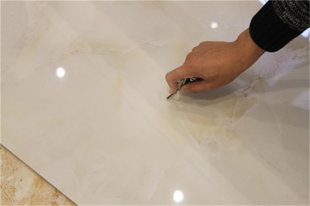 在修復時,可用毛筆蘸上一些修復劑描繪劃痕處,然后等待30分鐘再涂抹一次,干化后再涂抹一次,直到能看到劃痕處有反光,雖然比較麻煩,但可以讓瓷磚光亮如新。此外,也可以采用水磨機磨拋,不過在操作時,要小心,否則容易出現凹坑或大面積的損壞,造成不可挽回的后果。