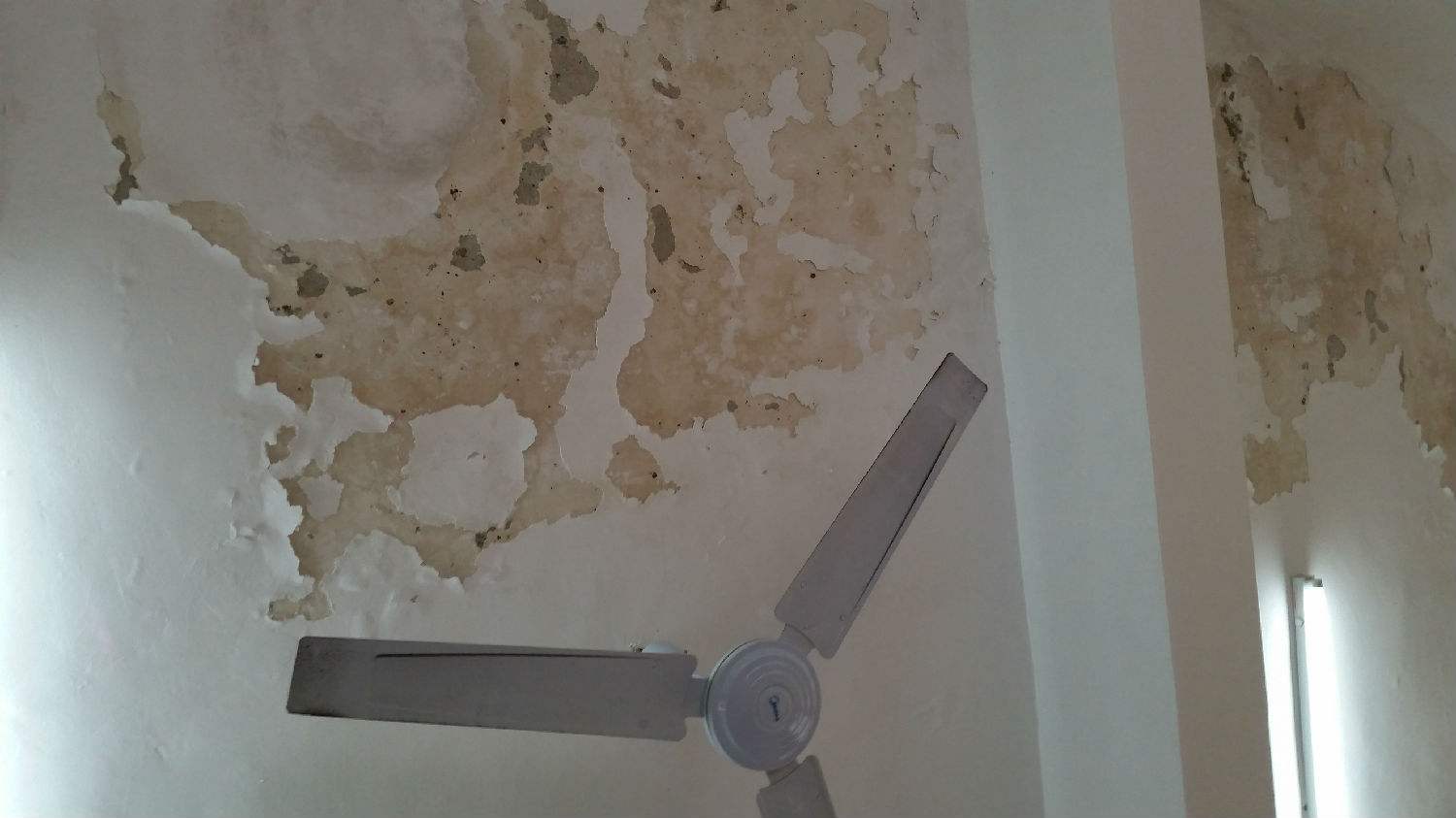 1、上面層膩子+石膏脫落的地方,露出光滑的頂面,據(jù)此判斷,這就是“水泥澆筑樓板”。