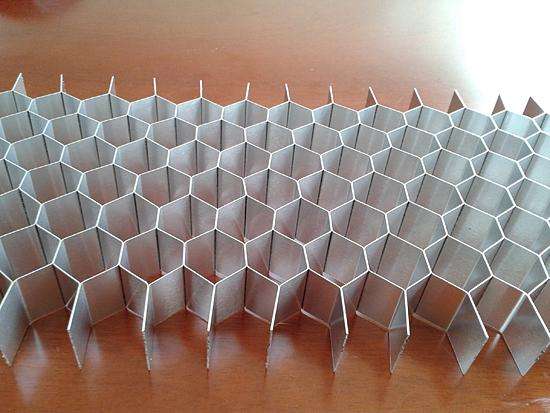 鋁蜂窩芯密度小(每平方米大約為3~7公斤),中心為鋁質(zhì)六邊形蜂窩,是同厚度同面積木板重量的1/5,玻璃的1/6、鋁材的1/7,大大降低建筑載荷和造價(jià)。