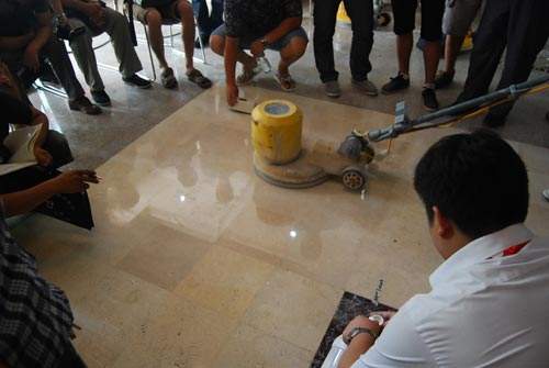 進行石材地面結晶處理之前,鋪貼完成面整體平整,無色差,每塊石材之間對角平齊,地面進行整體的清理,用干燥清潔的地拖清理干凈,地面無沙粒、雜質。