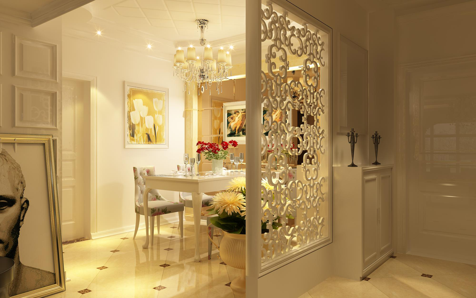 在進門的地方,運用了淺色的燈光,讓空間變得明亮優雅。墻上整齊擺放的油畫,也充滿著濃濃的藝術氣息。