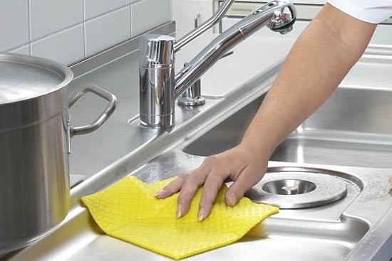 櫥柜的水池既要洗菜還要洗碗,容易沾染洗碗水中的油垢,如果沒有專門的水池清潔劑,在有油污的地方撒一點鹽,然后用廢舊的保鮮膜上下擦拭,擦拭后用溫水沖洗幾遍,也能讓水池光亮如新。水池的四周彎角和下水處可以準備專門的小刷子或者牙刷用細鹽、肥皂水、清潔劑擦拭,下水處的水蓋也最好用溫肥皂水浸泡20-30分鐘,達到理想的去污效果。