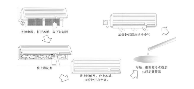 對于空調的清洗要分為三個部分的清洗:1、空調機體外殼的擦拭;2、空調過濾網的清洗;3、空調冷凝器和蒸發器的清洗。