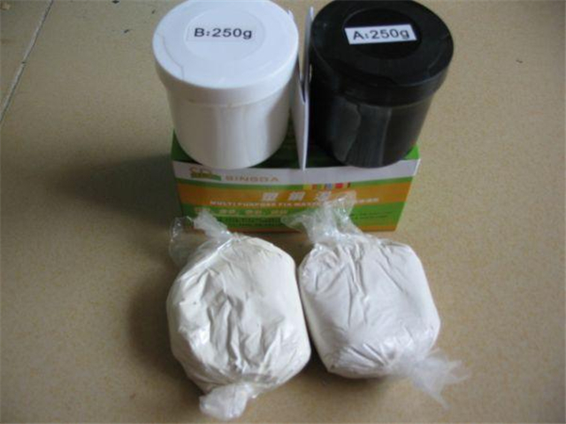2、從A、B組分中取等量1:1(體積比)混合均勻成同一種顏色,膠體粘手時,手沾濕即可解決。混合方法采取反復“拉伸一絞合一折疊”的“絞麻花”法。