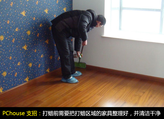 在開始打蠟前,需要把需要打蠟區域的家具整理好,確定出打蠟區域。同時還要將地板區域清潔干凈,確保打蠟前不要有灰塵或者其他污物,防止打蠟的光潔度。清潔一般采用擰干的拖把或軟布擦拭地板,清潔后,還需等待地板上的水分完全干燥才可打蠟。