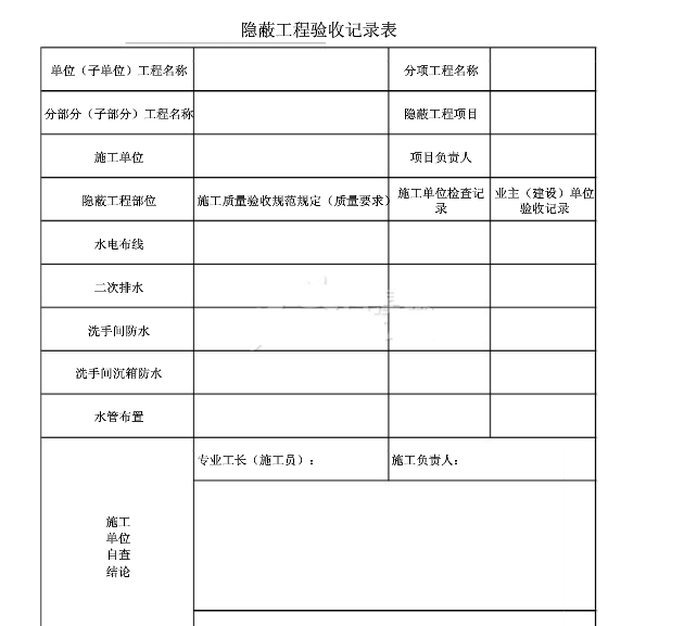 首頁 裝修流程 住前檢驗 隱蔽工程驗收規范 隱蔽工程驗收記錄表