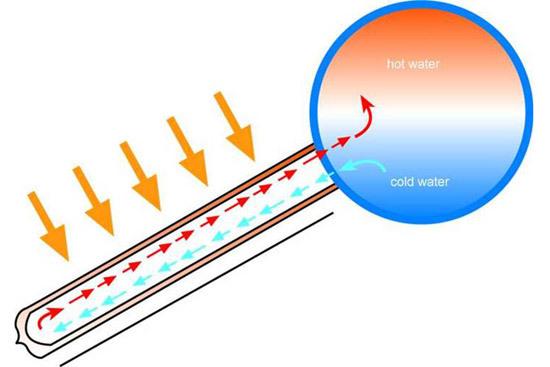 太陽能熱水器將太陽光能轉化為熱能,將水從低溫加熱至高溫,滿足人們對熱水的需求。太陽能熱水器按結構形式可分為真空管式和平板式兩種,真空管式需安裝在樓頂,而平板式則可安裝在商品房陽臺外面。 兩者工作原理一致:陽光穿過吸熱管的第一層玻璃照到第二層玻璃的黑色吸熱層上,將太陽光的熱量吸收,由于兩層玻璃之間是真空隔熱的,熱量不能向外傳,只能傳給玻璃管里的水,使管內的水得到加熱。水熱后便沿著玻璃管受熱面往上進入保溫儲水桶,桶內溫度相對較低的水沿著玻璃管背光面進入玻璃管補充,如此不斷循環,使保溫儲水桶內的水不斷加熱,從而達到熱水的目的。