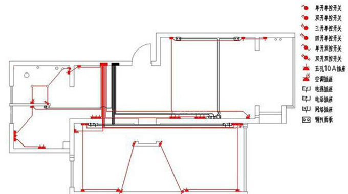 家居用電可以分為強電和弱電,強電就是燈具照明、電器使用等用電,弱電是電視、網絡、電話等信息用電。進行電線布線之前,一定要先根據居住者的習慣和需求,布置好燈、開關插座的數量和位置。布線多用暗埋管道的方式,管道多以PVC管和冷彎管為主,其中冷彎管是可以彎曲使用的。電線大多是從地面布線,安裝后需要注意保護,防止被踩裂。強弱電布線要保持一定的間距,大約30-50cm左右,防止出現串線,圖中的電路布線是以紅色為強電,黑色為弱電。管道內的電線必須是一個整體,不能有接頭的情況,接頭只可以在插座開關中出現。布線后要將電路路線記如圖錄下來,便于以后維修。