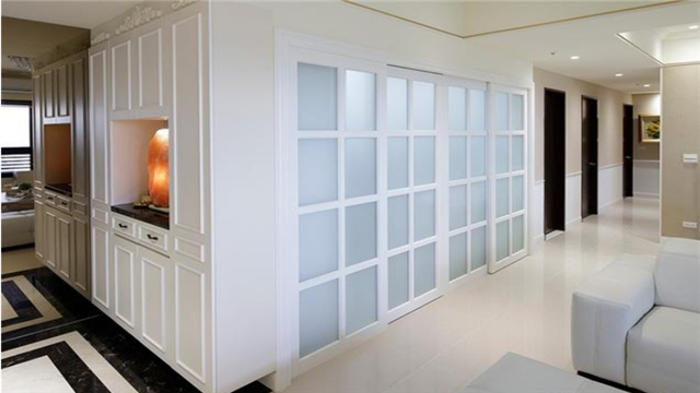 原有格局設定采全面開放式,從風水角度來說爐灶不展露尤佳,因此于廚房增設純白格屏拉門,不僅能化解風水禁忌也可達到隔絕油煙效果,在使用上也絲毫不受影響,拉開鄰靠于流理臺的門扇時,便可輕松接過烹調好的美味佳肴,也可在此擺放植栽、裝飾品,成為廚房端景的一部分。