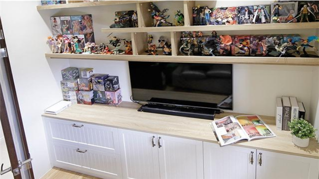 原先預想做為書房的空間,卻在實際生活后意外發展成孩子的視聽室,采用帶有復古質感的Nebraska系統板材所設置的開放式書柜,也順勢成為大兒子搜集模型玩具的最佳展示架,當琳瑯滿目的公仔一字排開,竟與錯落式層架完美融合。