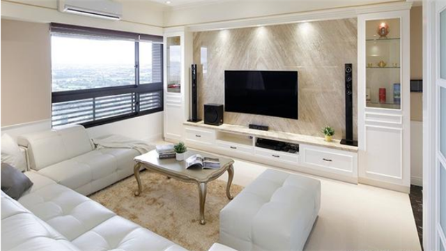 客廳延續玄關簡約清新氛圍,開放式格局以梁柱位置做為餐廳分界,天花板處飾以帶有金粉的涂漆線框,細致的襯托剔透的水晶燈,更散發出高貴氣息,并且挑選灰白色系的皮質沙發,圍塑高雅的品味。