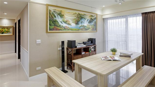 燈光設計:房屋因地理環境優勢,擁有絕佳視野與自然采光,因此在光源設計上主要以嵌燈適時補強,而客廳處為了加強視覺意象另外設置一盞水晶燈,當點亮光照時,不僅增強天花金邊木條色澤,也使畫框光澤更為突顯。