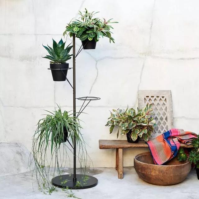 這是一個非常有現代感的植物支架,適合布置在戶外的空間,可以將它擺放在門廊處,或者是擺放在客廳,可以將盆栽植物擺上去,可以擺放至少四種中等大小的額盆栽,黑色的油漆花架搭配灰色或木地板哦都市不錯的選擇。