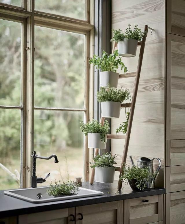 這里用到了一個非常別致的植物支架,直接布置在廚房里,傾斜的梯子可以用來擺放不同的盆栽植物,搭配一些白色的陶瓷盆,養護的都是一些香草植物,看起來格外清新,栽種的植物包括百里香、迷迭香、羅勒和薄荷等植物。