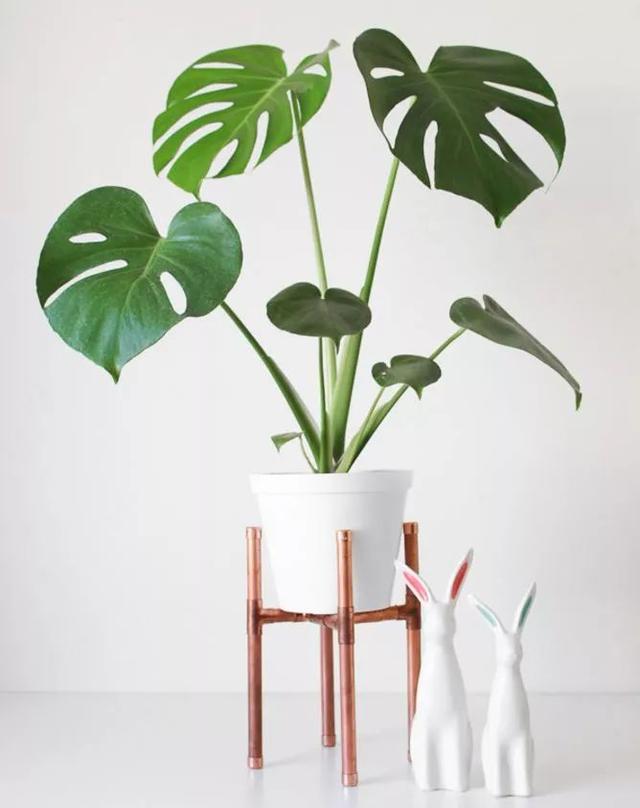 這個盆栽植物看起來是不是很清新,實際上就是用簡單的花盆和支架搭配出來的,用到了紅陶盆,之后噴上白漆,選擇了銅管支架,將白色的盆栽龜背竹擺上去之后,就顯得格外迷人。