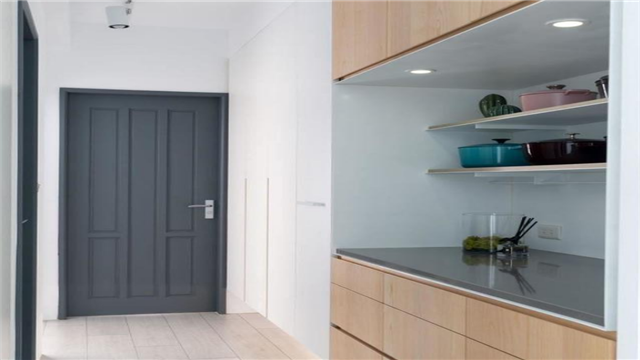 走道變化廚房延伸 業主認為私領域空間不必太大,因此縮小部分主臥空間,將原本主臥室的入口改在客廳后,走道變身廚房的備餐柜,女主人喜愛的各式鑄鐵鍋也有專屬的展示收納空間,無形中讓廚房空間延伸。與客廳一樣的木色與白色跳色搭配,讓平淡無奇的走道也展現多樣的空間表情。