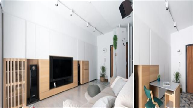 客廳內縮創造收納 約36平公共空間里,客廳幾乎占去一半,原本有無法移動的超大梁柱,干脆全部包覆起來形成一整面墻的收納,長6.8公尺、高0.7公尺,而深度0.5公尺,不但創造出近8平的儲藏空間,拉齊格線后,讓客廳呈現完整的長方形,看來簡潔俐落(左圖)。整面墻的收納下半部,近2/3區域采取北歐風的栓木木皮做成柜面,形成活潑的跳色,靠窗處做出格柵收納3C視聽器材,而最靠玄關處則隱藏小餐桌,等于把餐廳融入客廳中,連椅子的收納都量身打造,完美地發揮最大坪效(右圖)。