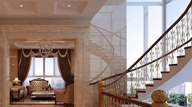 這是一款看起來很富貴大氣的小復(fù)式裝修,更有點像住別墅的大戶人家。首先在面積上,要比一般的小復(fù)式面積大,一樓客廳的地面是大理石的,皮質(zhì)的沙發(fā)盡顯貴族風(fēng)范,紅褐色的窗簾穩(wěn)重大氣,天花板上的大吊燈使房間不會那么空洞。復(fù)古的樓梯采用雕花,與整體的裝修風(fēng)格相匹配。