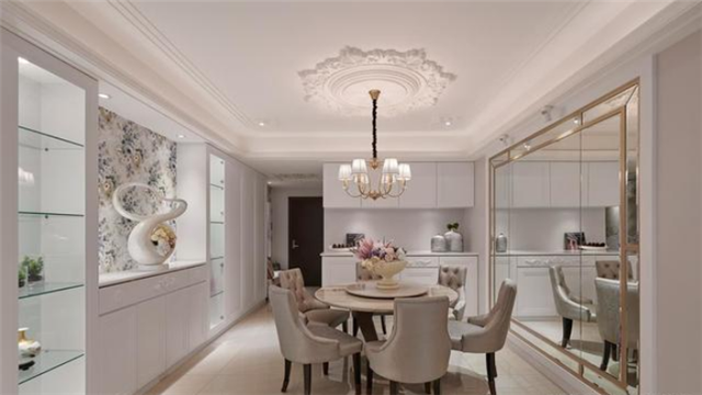 餐廳規劃圓桌不僅配合天花板的圓型圖騰和燈飾,也象征著一家人圓融氛圍,天花藉由層層堆疊的弧型設計,帶出餐區優雅的新古典語匯。