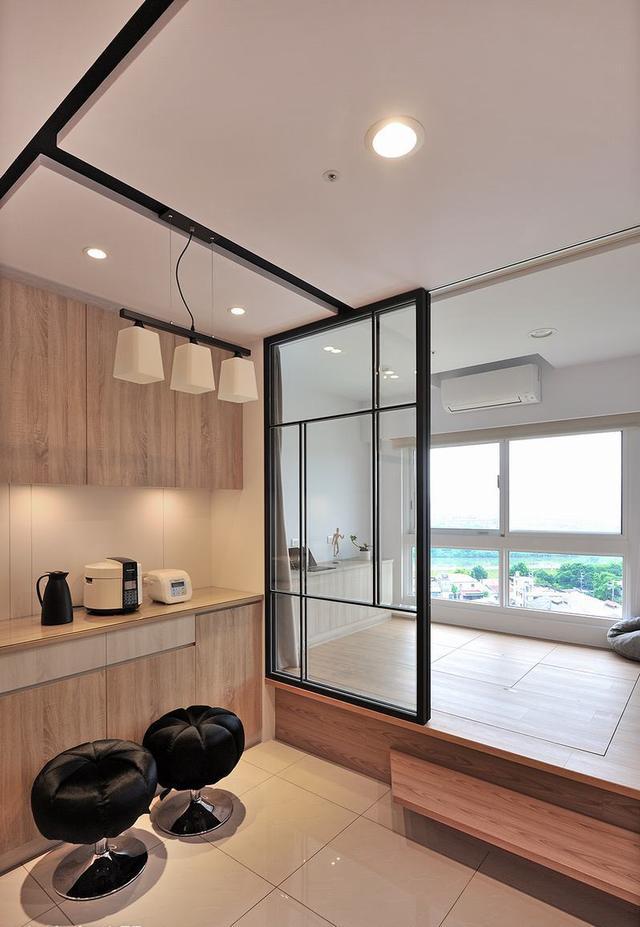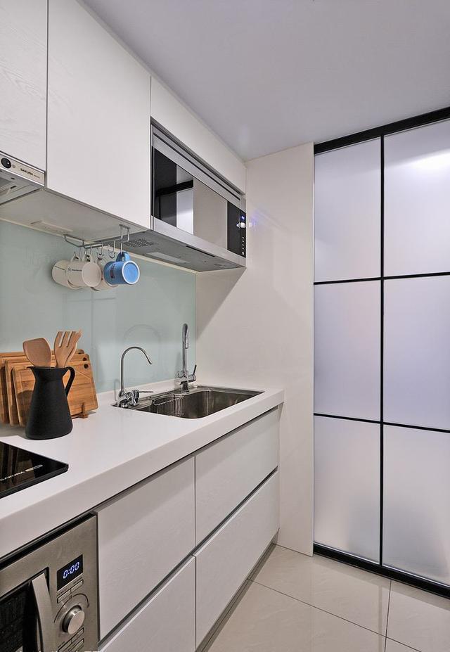 原屋廚房并沒有門,設計團隊選用鐵件霧玻推拉門作為廚房與公領域的隔屏,一方面讓公區采光可以穿透進來,另一方面也阻隔了油煙溢散的問題。