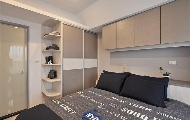 灰色調鋪敘的主臥空間,搭配淺木紋柜體與拉門衣柜,突顯屋主喜愛的現代風格空間質韻。