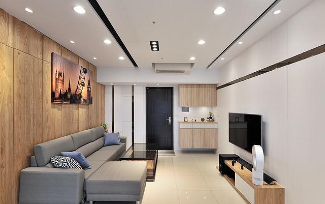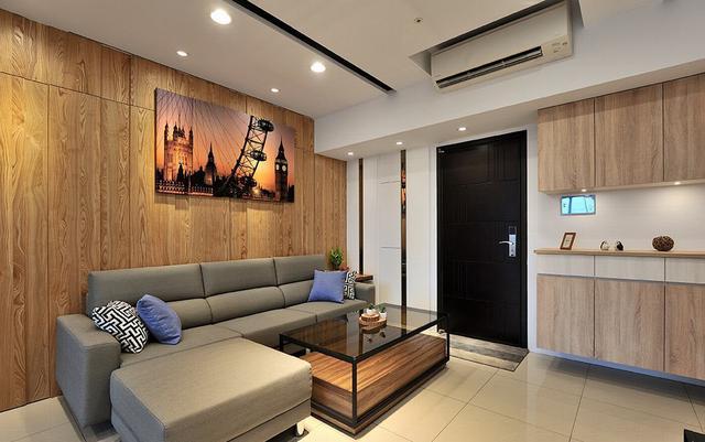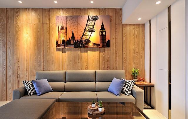 沙發背墻則以凹凸造形的水曲柳木鋪敘,立面活潑也有延伸性。至于屋主所需的收納機能,主要集中規劃于和室收納地板以及臥室空間,公區則以兩座上下吊柜做收納。