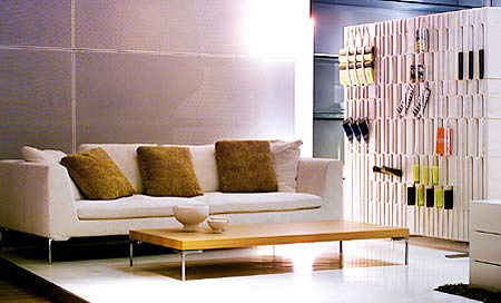 ??? 選用這套家具的人非常中庸穩定。溫和典雅,不只有50年代初期的明快線條,在用色配搭上還有點大和民族格式。沙發上不同布質在選料上非常謹慎,不只為了觸感,也考慮到光線反映出來的質感。特矮的咖啡桌,桌面為橡木自然色,與日本風情擺設配合融洽。旁邊巨型站立屏風,倒是一項品味幽默,你幾乎什么都能夾到屏風上去:書本、賬單、報紙、輕衣物或不能公諸于世的東西,讓它成為廳里的話題。長型站燈,個性柔和,讓人在室內的泛光式明亮中感覺安定溫馨。