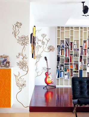 ??? 簡約風格的家中,往往蘊涵著一語道破的驚喜,如同一個不顯山露水的人,卻可能擁有耐人尋味的人格魅力。二者另一個共同點在于,都需要我們去發現和探尋。進門正對著的墻壁,是給來者第一眼的印象,起初不敢畫,因為這個位置太重要,太顯眼。丙烯、金漆,出來后的效果令人滿意,于是它們繼續“攀爬” 到客廳的墻面上。