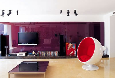??? 客廳:視聽區域干凈利落,沒有多余的修飾,充分突顯了刻意強調的功能。卸得多,裝得少 完全開放的空間里,四白落地,素凈、淡然,卻有股凜冽的豪爽,大塊地磚將這種氣質襯托得更加鮮明,背景墻雖然用了紫色,依然與外部活動區域保持感官上的統一。