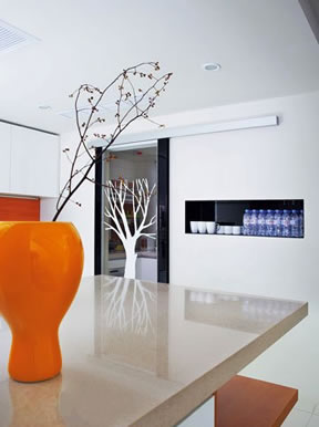 ??? 一間小的廚房間,由推拉門隔離。玻璃門上的白色樹枝圖案,與屋內的白色統一一致。