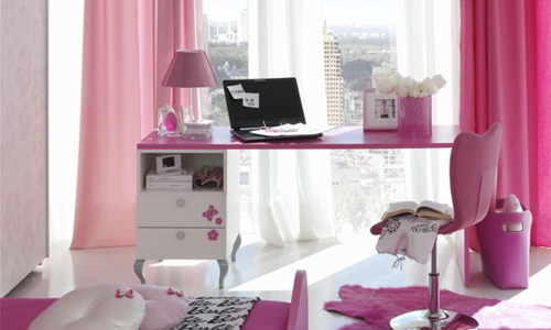 ??? 家具擺放錯落有致,粉紅色的窗簾、書桌、轉椅、碎紙筒、地毯、床互相呼應,相映成趣。在這么一個陽光明媚的午后,不妨泡一杯茶、捧一本散文書,與陽光爛漫地約會。