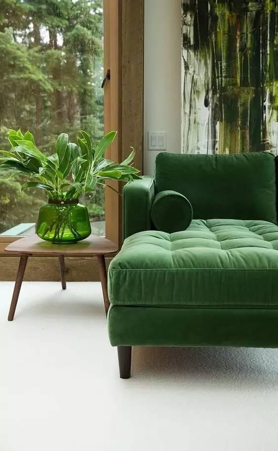 天鵝絨的深綠沙發(fā)是冰老裝修欲望清單上的一項