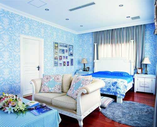 ???? 點睛:藍色的淺淡清雅,最適合作為背景色大面積使用,壁紙、墻面涂料、軟裝是藍色的活躍舞臺。要想烘托出藍色的嫵媚多變,用白色的家具和配飾進行調和最為妥當。