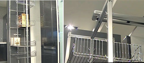 ??? 若廚房的調味瓶罐、補充品很多,像大家俗稱的(大怪物),也就是拉籃式的收納架,就能幫助主婦們快速收納以及取用物品,尤其可以靈活旋轉的設計,使不同角度使用的功能更流暢,甚至有結合電動式的大怪物,輕輕觸動門片,開啟完全不費力。